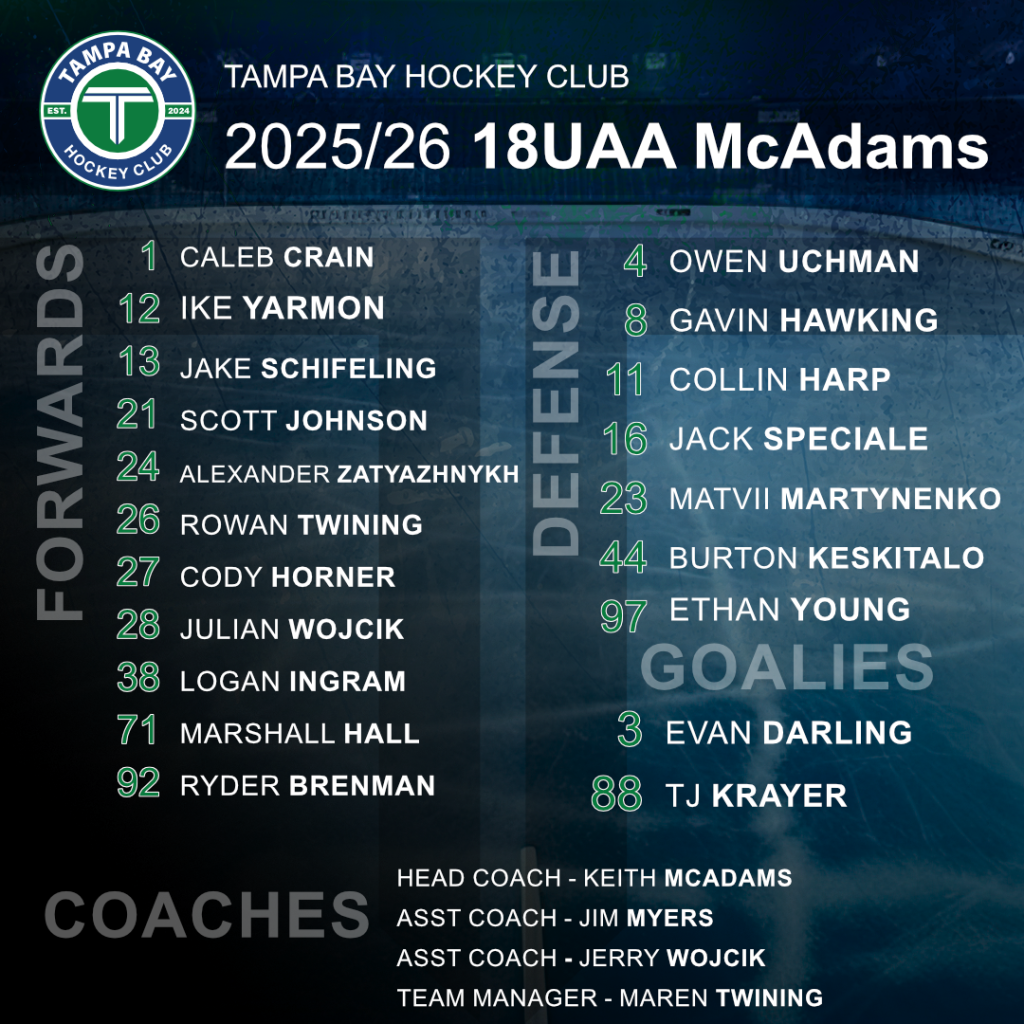 18UAA – 2025/2026 Head Coach Keith Mcadamas Assistant Coach Jim Myers Assistant CoachJerry Wojcik Team ManagerMary Twining