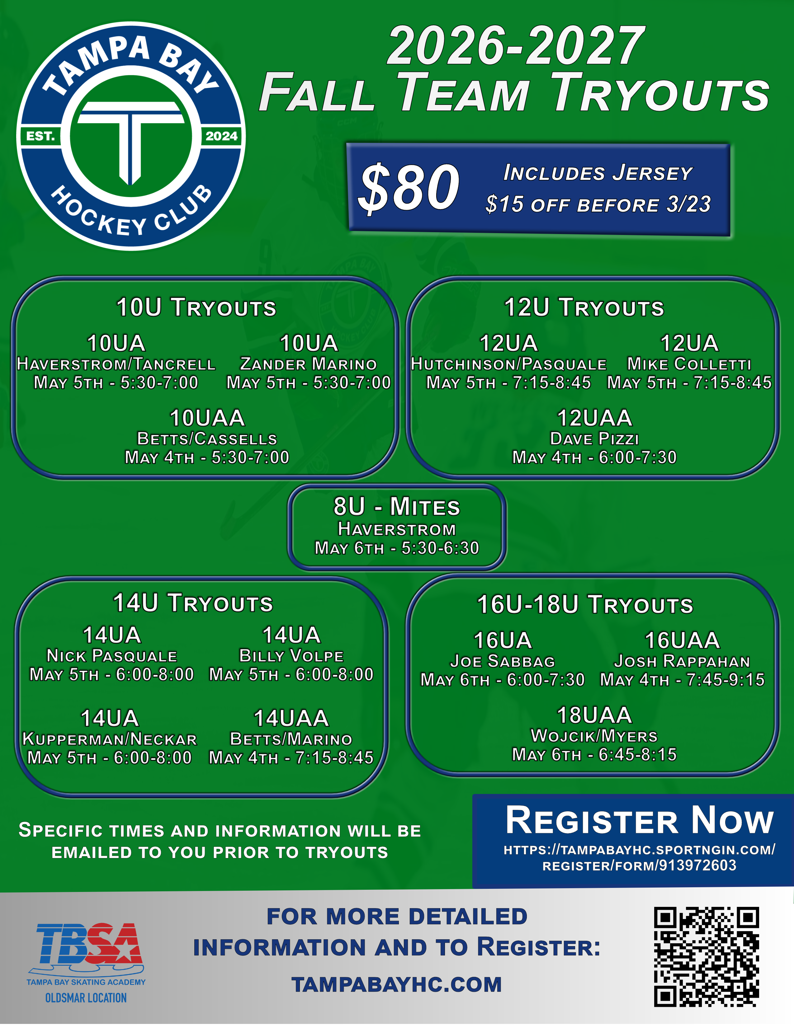 Tryouts begin on Monday, May 4th and run through Thursday, May 7th. Learn more and register now at https://www.tampabayhc.com/2026-2027-season-tryouts/